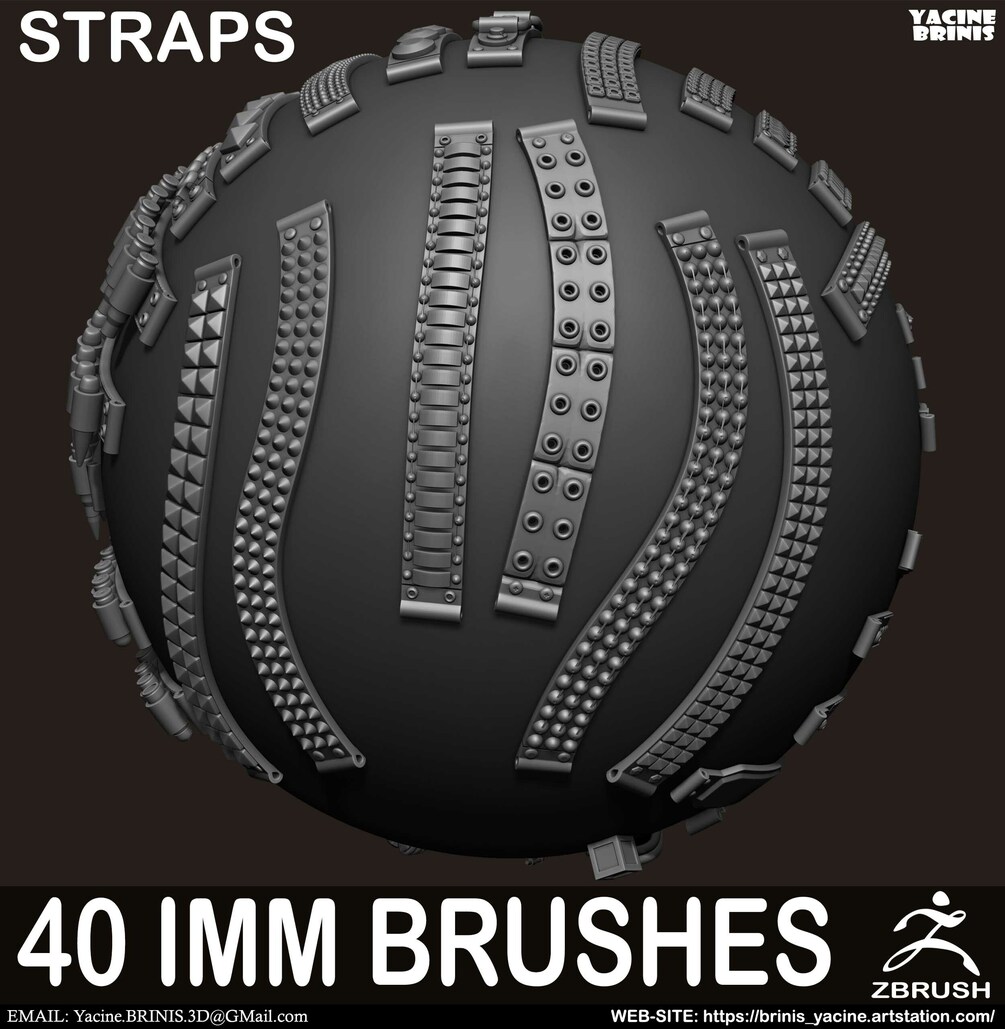 Zbrush - Straps 40 IMM Brush + Meshes40 Straps Brushes all contained within one Multi-mesh brush and Low poly meshes.For use with Zbrush (2018) and up.